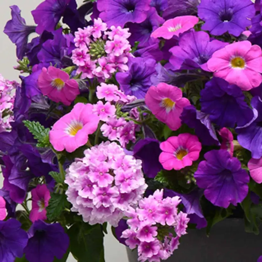 MixMaster Big Flirt! 12-inch Hanging Basket. Contains: Petchoa SuerCal Pink Ice, Petunia Color Rush Blue, and Verbena EnduraScape Pink Bicolor. with plenty of texture.