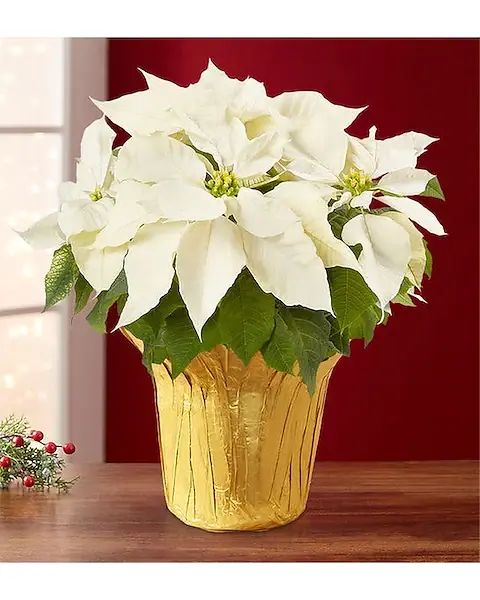 Elegant, white Poinsettia. White bracts with medium green foliage. A clean, modern look for a classic holiday flower. Includes foil pot cover. Select size from drop down menu.